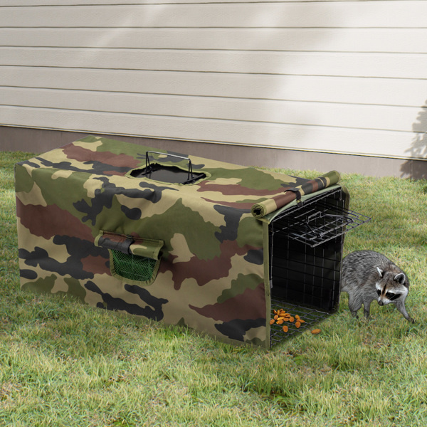 This 32-inch live animal trap cage with a removable weatherproof cover is designed for safe, humane trapping of medium-sized nuisance animals like raccoons, opossums, cats, and groundhogs. Its durable iron frame and secure mesh structure ensure reliability outdoors, while the included Oxford fabric cover helps conceal the trap, increasing capture effectiveness and offering comfort and protection to the trapped animal. Ideal for humane animal rescue and relocation.