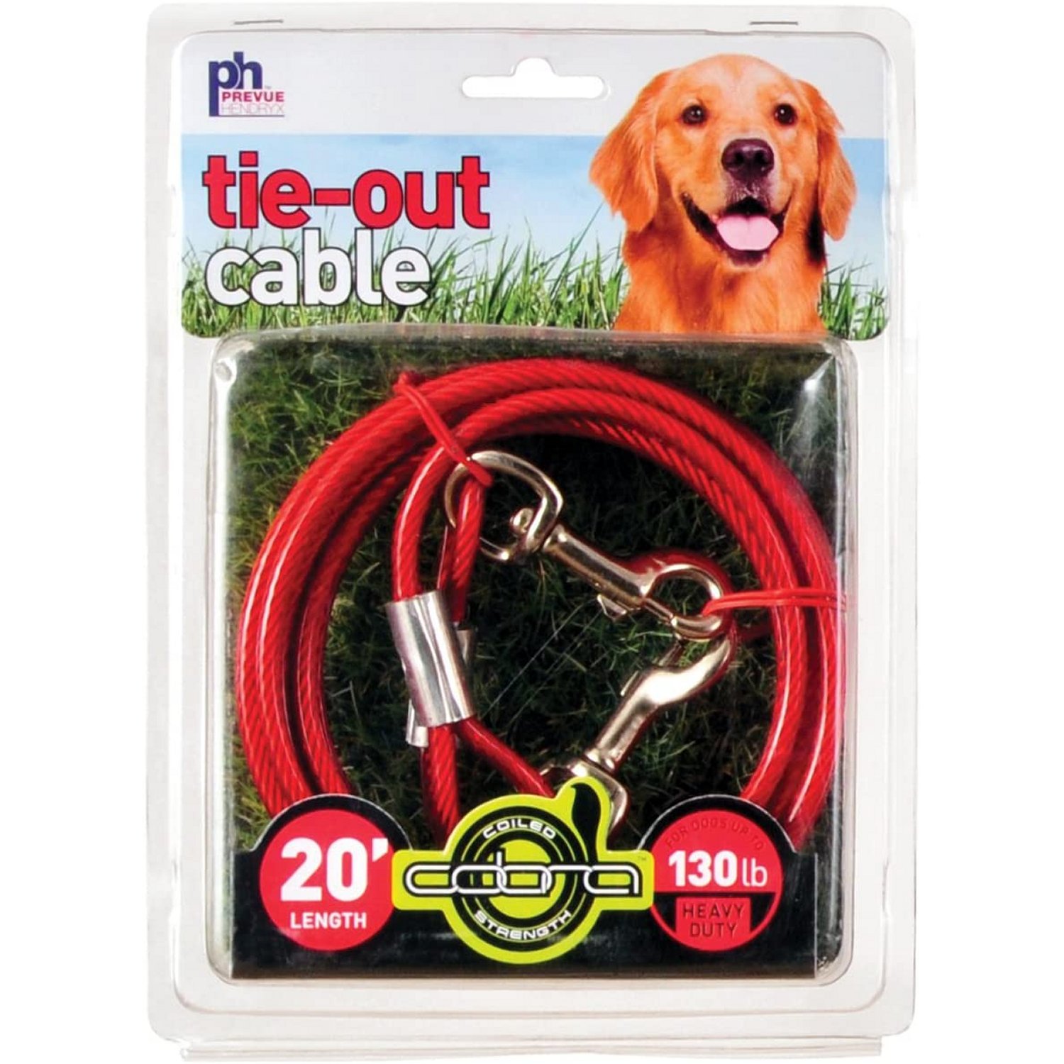 Prevue Pet Products heavy-duty 20Æ TIE-OUT cable 2122 is designed for dogs up to 130 lbs. Heavy duty, galvanized aircraft-grade wound-steel cable is housed within crack-resistant, high visibility red vinyl casing to ensure your dog stays safe and secure. Premium quality die-cast iron swivel bolt snaps at both ends to connect easily. Heavy duty tie out cable is 20 foot long with a 4.0 mm diameter wire cable; 6.3 mm in vinyl casing.