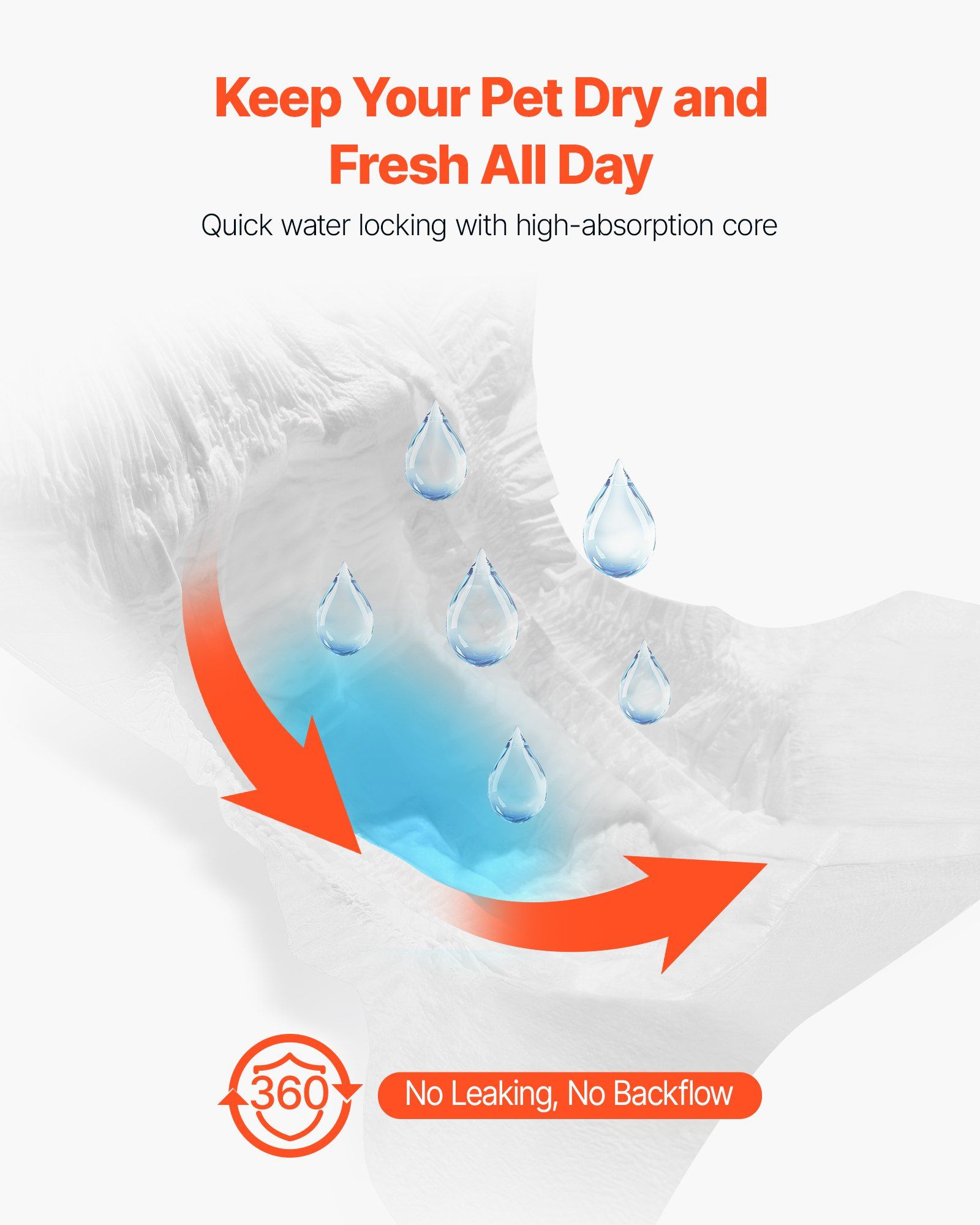 1.Super Absorbent: VEVOR S-sized disposable female dog diapers feature a super absorbent core that quickly locks in liquid, offering 360° leak-proof protection with no backflow. Perfect for dogs in heat cycles, pet training, incontinence, post-surgery recovery, and travel. Suitable Waist Size: 12-20 inches / 30.48 - 50.8 cm