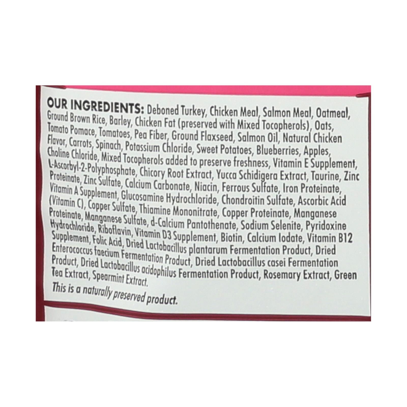 ingredients : deboned turkey;chicken meal;salmon meal;oatmeal;ground brown rice;barley;chicken fat;preserved with mixed tocopherols;oats tomato pomace;tomatoes;pea fiber;ground flaxseed;salmon oil;natural chicken flavor;carrots;spinach;potassium chloride;sweet potatoes;blueberries;apples;choline chloride;mixed tocopherols added to preserve freshness;vitamin e supplement;l-ascorbyl-2-polyphosphate;chicory root extract;yucca schidigera extract;taurine;zinc proteinate;zinc sulfate;calcium carbonate;niacin;ferrou